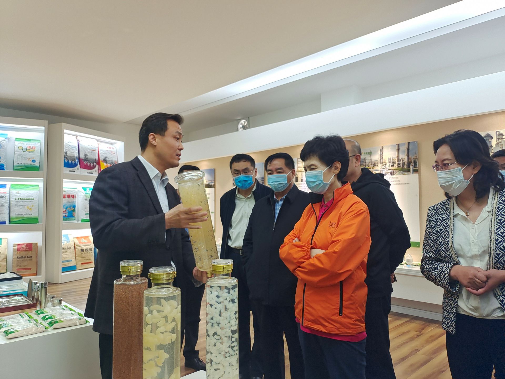 在公司展厅 , 高会长一行人认真听取了李总对于内蒙米乐官方网页版-米乐(中国)公司的生产、经营情况以及国际贸易现状的介绍,了解了企业在开展对外贸易中存在的困难和问题。